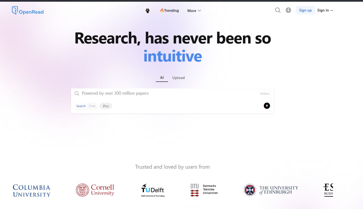 OpenRead is a great solution for quick paper searches. It has a large database of scientific articles across many fields. Once you log in, you’ll see a simple prompt window where you can start your research. After entering your prompt, OpenRead will return hundreds of sources to explore.