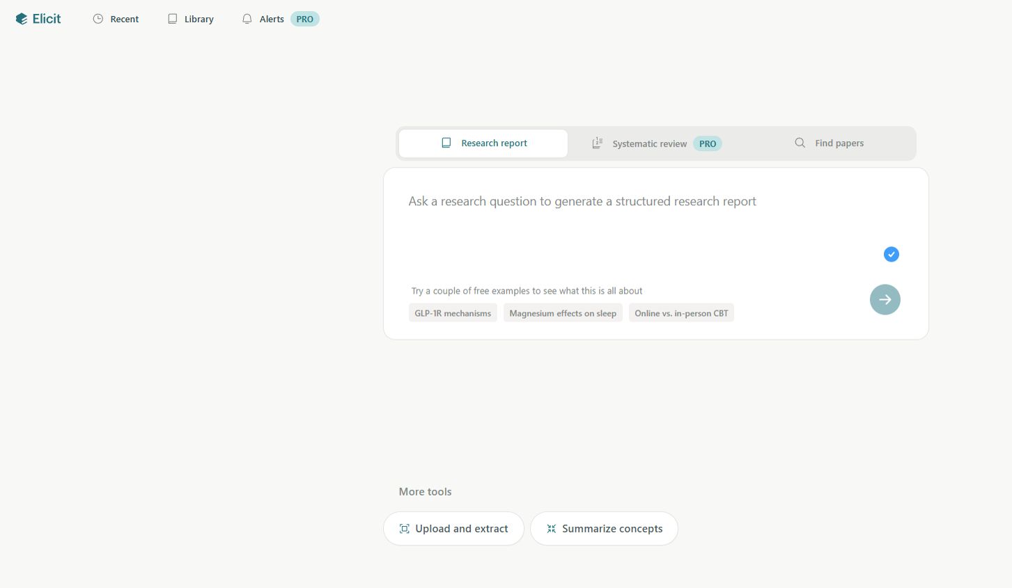 Elicit offers a chat interface divided into three main modules: Research Report, Systematic Review, and Find Papers. Depending on your account type, you’ll have access to different research depths. The fast mode screens up to 50 sources, while the comprehensive mode can process up to 500. In practice, this means you might get very different results for the same prompt.