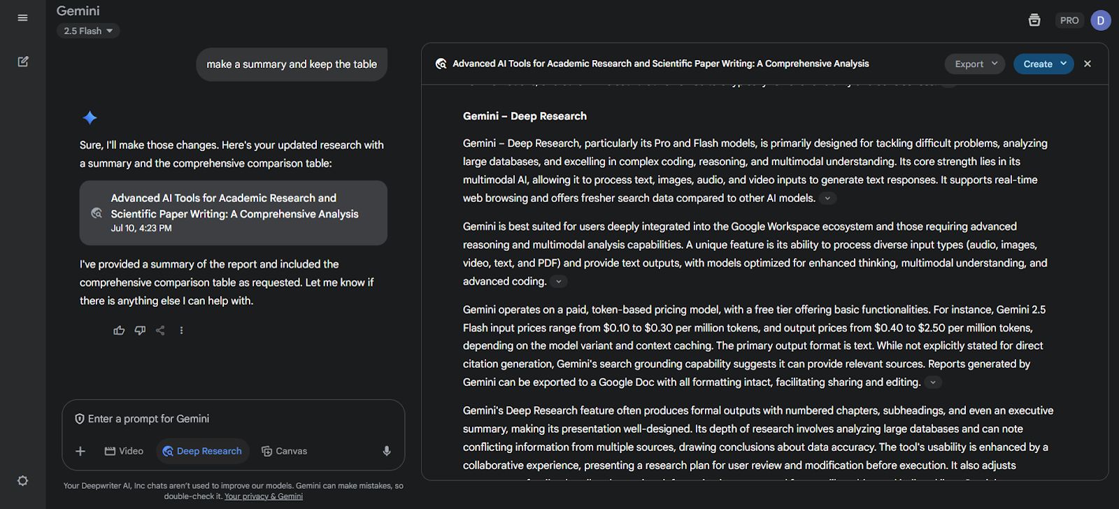 Gemini works inside Google Workspace, which makes it a flexible and familiar tool. It offers summaries, suggestions, and contextual searches. Its academic precision is still growing. The Deep Research feature can create multi step plans and connect Google Search with your private files in Gmail and Drive.